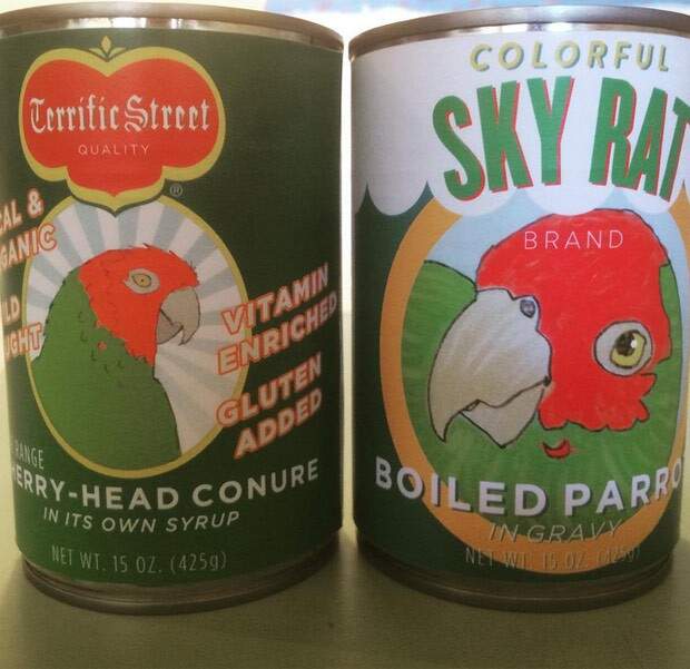 Uma loja de San Francisco, no Estado da Califórnia (EUA), provocou polêmica ao exibir na vitrine latas de “carne de papagaio”. As latas traziam a imagem de um papagaio estampada.