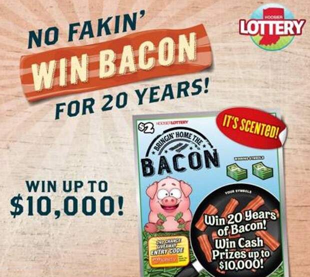 Uma loteria no estado de Indiana (EUA) lançou uma raspadinha que oferece um prêmio bastante incomum. Além de prêmios em dinheiro, o apostador pode ganhar fornecimento de bacon por 20 anos. Além disso, a raspadinha tem aroma de bacon.