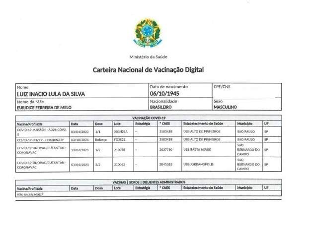 O comprovante de vacinação do presidente informa que Lula tomou quatro doses de vacina contra a covid: as duas primeiras foram de Coronavac (em março e abril de 2021, em São Bernardo do Campo); a terceira, de Pfizer (em outubro de 2021, em São Paulo); a última e mais recente, da Janssen, também na capital do Estado de São Paulo, em abril de 2022.