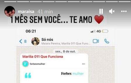 Na data em que o acidente aéreo que matou Marília Mendonça e outras quatro pessoas em Caratinga, Minas Gerais, completou um mês, a cantora Maraisa, que faz dupla com Maiara, lembrou mensagens trocadas com a cantora, amiga e parceira musical das duas no projeto “Patroas”. No título da postagem, Maiara escreveu: “Um mês sem você, te amo…”.