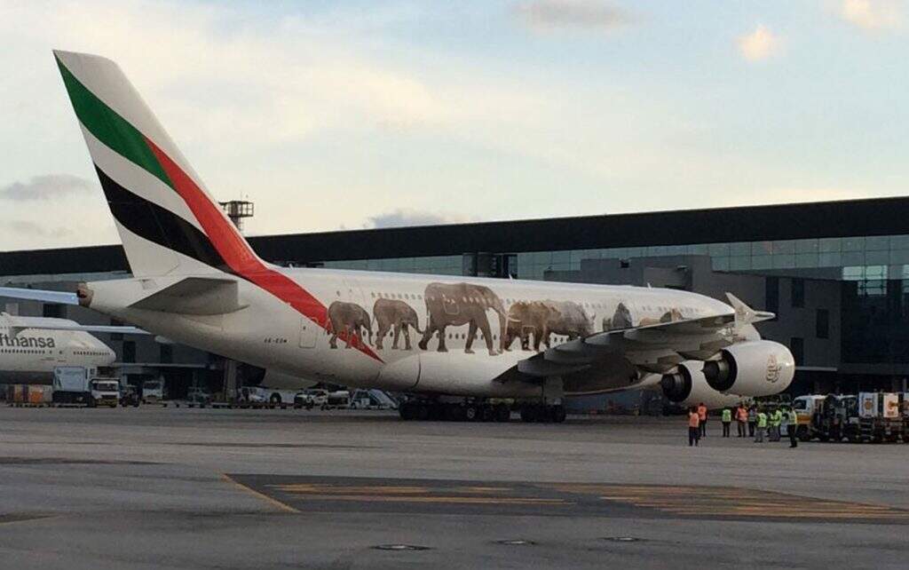 O avião chegou com animais como elefante, rinoceronte, leão e gorila decorando sua carenagem e reebeu um banho de “batismo”, com água jogada por dois caminhões-pipa.
