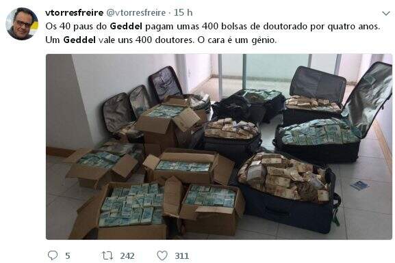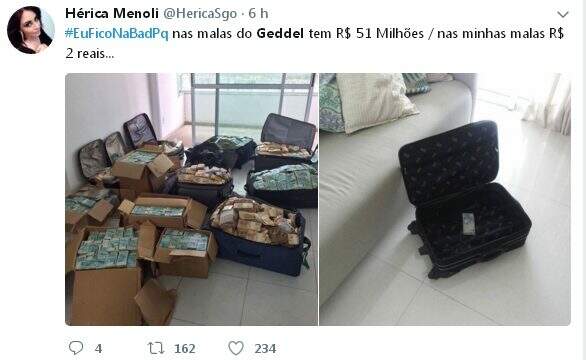 Os R$ 51 milhões apreendidos em diversas malas e caixas no bunker do ex-ministro Geddel Vieira Lima viraram memes. Embora chocantes, as imagens rapidamente viraram piada nas redes sociais.