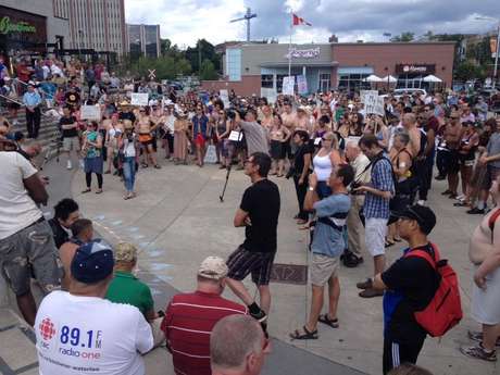 A manifestação foi convocada poucos dias depois de um policial ordenar a três mulheres de Kitchener que cobrissem os seios quando elas andavam de bicicleta pela cidade, segundo a imprensa local.