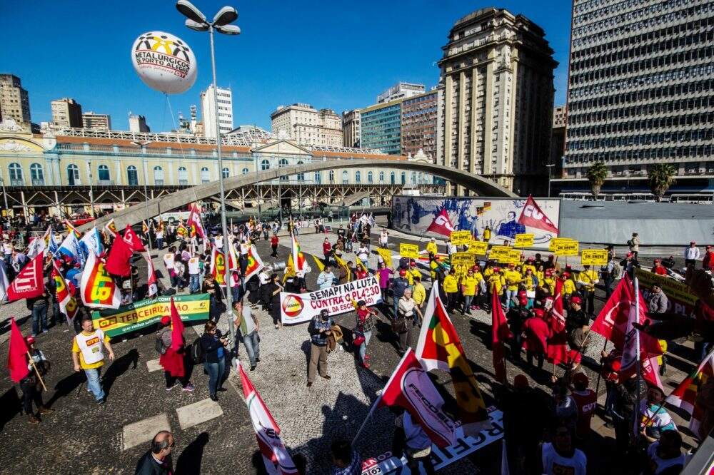 Organizado por várias centrais sindicais, como CUT, UGT, Intersindical, CSP Conlutas, o grupo fez caminhada pelo Centro até a Assembleia Legislativa. Ao passarem pela esquina democrática, os manifestantes fizeram um enterro simbólico do presidente da Câmara de Deputados, Eduardo Cunha, fervoroso defensor da terceirização.