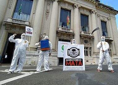 Integrantes do movimento Frente Cidadã Contra os Agrotóxicos realizou na manhã desta terçã-feira (15) um protesto pacífico no Centro Histórico de Porto Alegre, a fim de chamar a atenção da sociedade, deputados estaduais e o governo do Estado para o teor do Projeto de Lei nº 260/2020, que prevê a flexibilização do uso de agrotóxicos no Rio Grande do Sul. O local escolhido para a manifestação foi o espaço em frente ao Palácio Piratini.