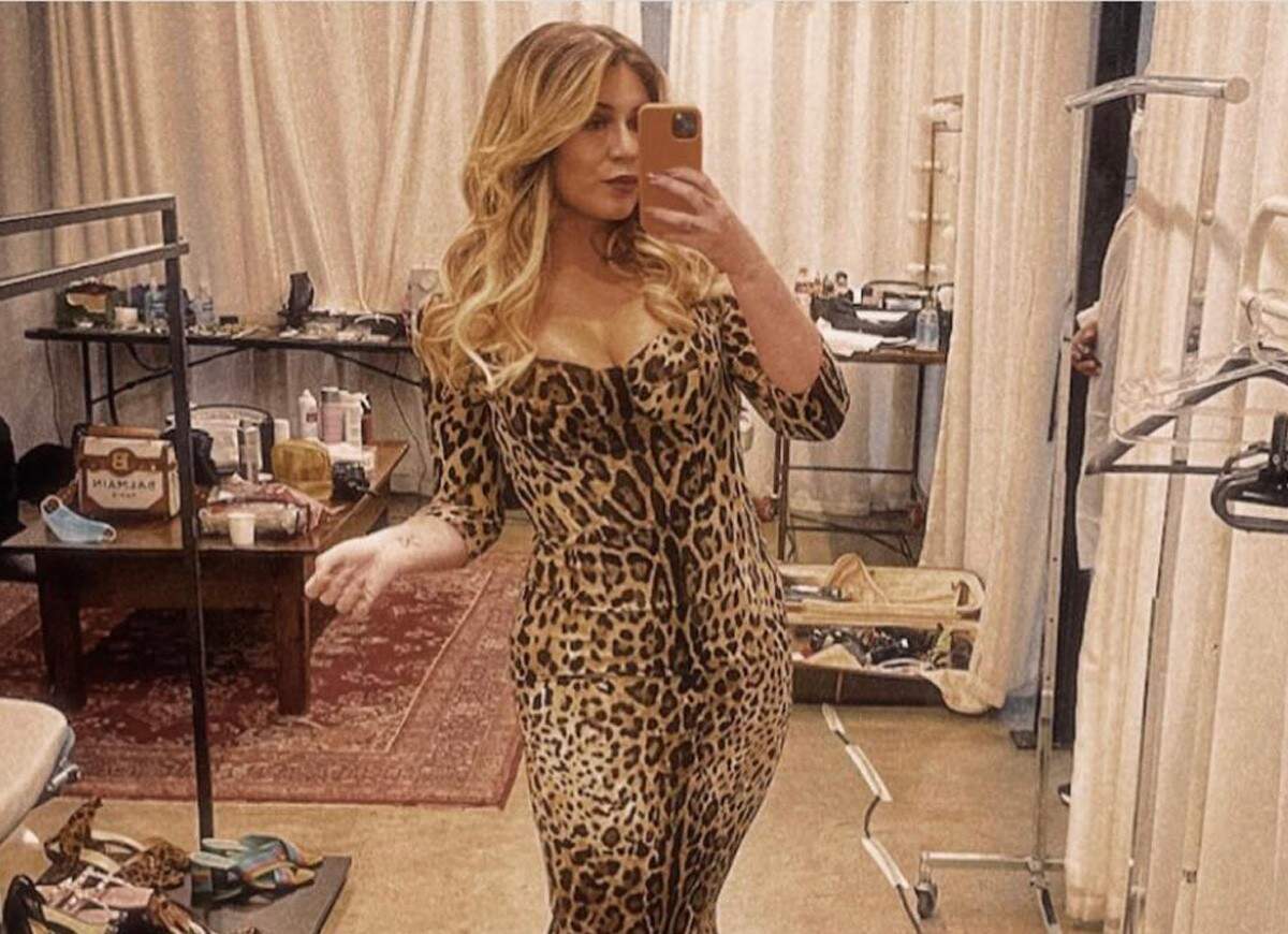 O vestido, da marca de luxo italiana Dolce & Gabbana, custa R$ 13 mil, e conta com decote em coração, mangas 3/4, fechamento por zíper traseiro oculto, estampa de leopardo, estilo tubinho e fenda traseira. No fundo da imagem, também é possível ver uma bolsa da grife Balmain avaliada em pouco mais de R$ 20,5 mil.