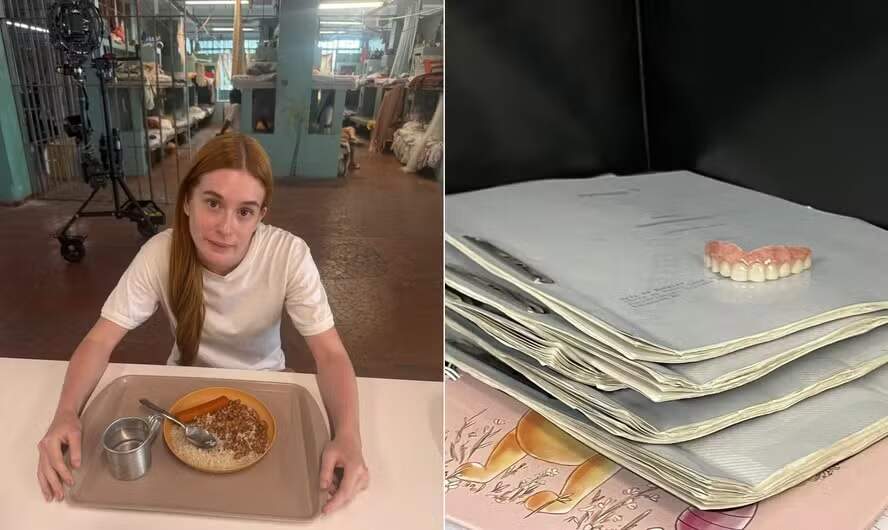 A alteração mais evidente está nos dentes. Marina contou que, ainda na preparação, conversou longamente com a equipe de caracterização sobre o impacto visual que desejava alcançar. A ideia era alterar a embocadura, criando uma presença facial distinta da que o público está acostumado a ver. Para isso, optou pelo uso de uma prótese dentária. O recurso, segundo ela, foi fundamental para entrar no papel e provocar a sensação de estranhamento que buscava transmitir.