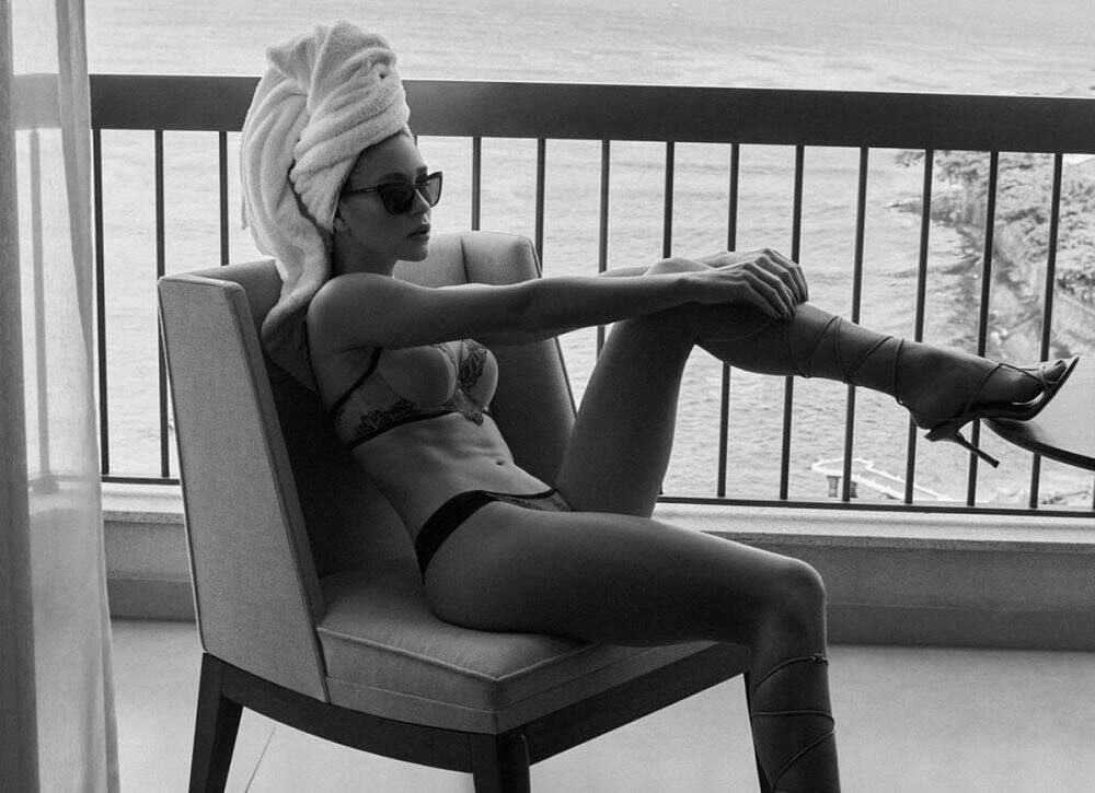 Marina Ruy Barbosa compartilhou com os fãs no Instagram uma bela foto em preto e branco em que aparece apenas de calcinha e sutiã, com uma toalha enrolada na cabeça. Na imagem no sábado (18), ela está sentada em uma poltrona, em uma varanda, com o mar ao fundo, arrumando a sandália de salto altíssimo.