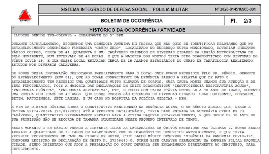 No dia 22 de março, a Polícia Militar mineira recebeu uma denúncia anônima, em que um morador relatava a existência de corpos acumulados em uma funerária da Região Metropolitana de Belo Horizonte. Ao chegar ao local, a equipe do 5º Batalhão se deparou com o gerente da funerária, que narrou que, entre os dias 20 e 22 deste mês, 73 cadáveres haviam chegado à funerária com laudos da causa da morte parecidos: pneumonia ou insuficiência respiratória.