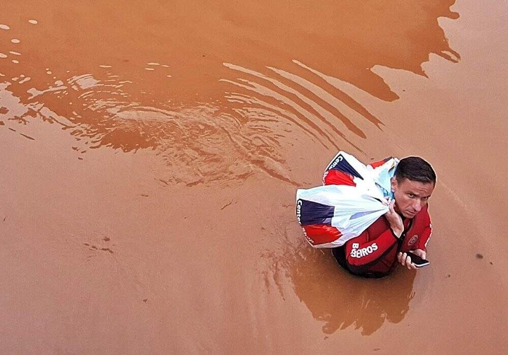“Não consuma alimentos que tenham tido contato com a água da inundação ou lama, incluindo alimentos embalados, enlatados ou alimentos perecíveis [como frutas, legumes e verduras]. Antes de beber, é essencial adotar medidas para tornar a água segura para consumo.”