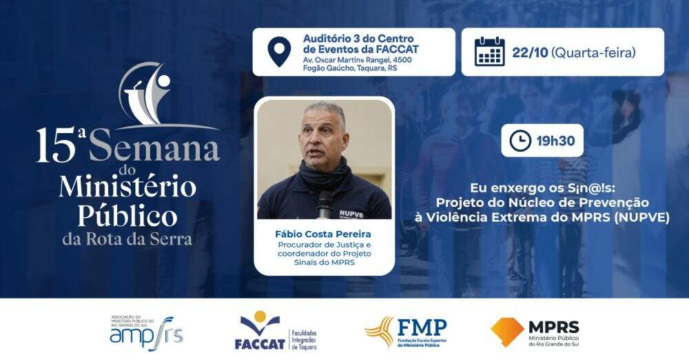 A 15ª Semana do Ministério Público da Rota da Serra será realizada na quarta-feira, 22 de outubro, às 19h30, no Auditório 3 do Centro de Eventos da FACCAT, em Taquara. A entrada é gratuita e aberta ao público, com foco especial em estudantes, profissionais da área jurídica, educadores e lideranças comunitárias. A palestra “Eu enxergo os Sin@is – Projeto do Núcleo de Prevenção à Violência Extrema (NUPVE)” será conduzida pelo procurador de Justiça Fábio Costa Pereira. (por Gisele Flores)