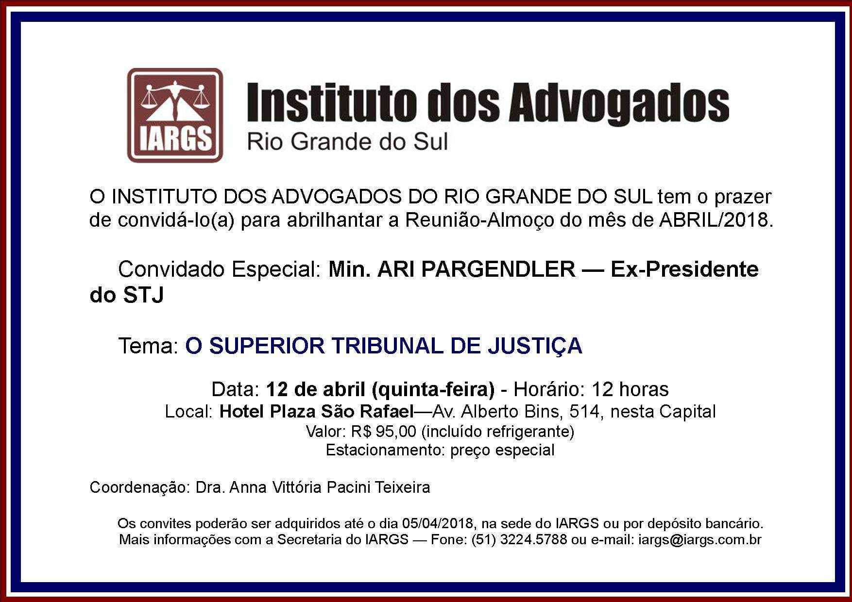No dia 12 de abril, quinta-feira, o Ministro Ari Pargendler, ex-presidente do STJ, será o convidado especial da Reunião-Almoço do IARGS (Instituto dos Advogados do RS), a partir das 12h, no Hotel Plaza São Rafael. O tema da sua palestra será “O Superior Tribunal de Justiça”.