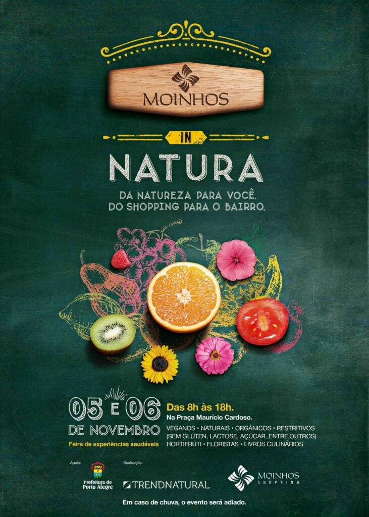 O Moinhos Shopping promove no próximo final de semana, nos dias 5 e 6 de novembro, na Praça Maurício Cardoso em Porto Alegre, a Moinhos In Natura, feira de rua aberta ao público que irá oferecer experiências voltadas à promoção de hábitos saudáveis e educação alimentar. O evento contará com uma programação completa para a família com expositores, degustações, entretenimento para crianças e show musical. No local, 20 bancas com expositores alinhados a práticas naturais e saudáveis irão oferecer experimentação e venda de produtos, entre itens orgânicos e focados nos públicos vegano e celíaco, além de flores, temperos e livros de culinária.