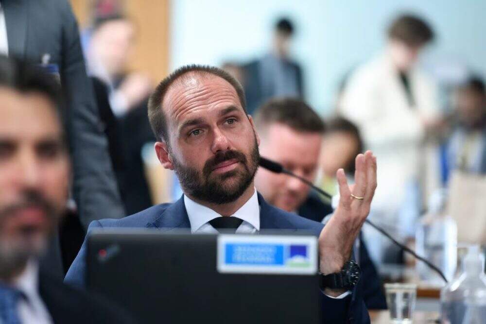 Eduardo diverge do que foi decidido pelo seu partido, o PL, nesta segunda-feira (24). O encontro na sede da legenda reuniu cerca de 50 parlamentares, teve o senador Flávio Bolsonaro (PL-RJ) ungido como porta-voz do pai e a ex-primeira-dama Michelle Bolsonaro cobrando que os correligionários parem de lavar roupa suja em público.