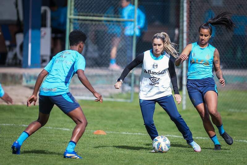 Foto: Caroline Motta/GrêmioNesta sexta-feira (15), o elenco das Mosqueteiras concluiu mais um dia de treinamentos intensos no Complexo Esportivo da Ulbra, em Canoas, visando o confronto contra o Flamengo de São Pedro, pela terceira rodada do Campeonato Gaúcho Feminino. A partida será disputada neste sábado (16), às 15 horas, no Campo do Flamengo, em Tenente Portela, no noroeste do Estado.