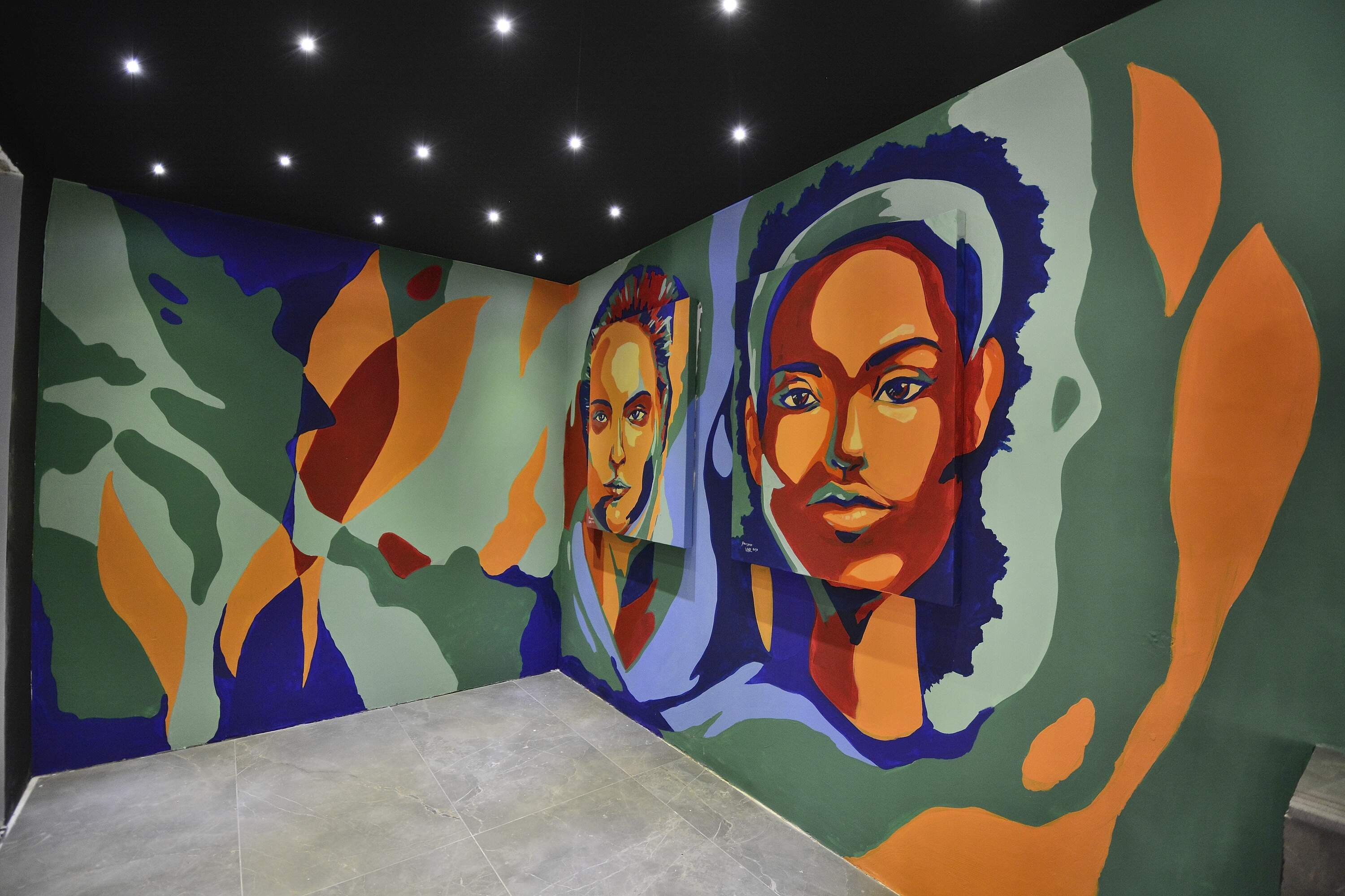 No primeiro patamar, a arte com cores vivas em elementos gráficos misturados com faces femininas que se estendem além das telas para as paredes, chama a atenção e fazem o contraponto de cor no ambiente. A iluminação cênica também é destaque no ambiente. O jogo de luz e sombra da luminária dourada convida todos a subirem pela escadaria, e os focos de luz no segundo lance criam um efeito de céu estrelado. “A ideia é surpreender, gerando uma experiência prazerosa, diferente e única”, ressalta a arquiteta do projeto.