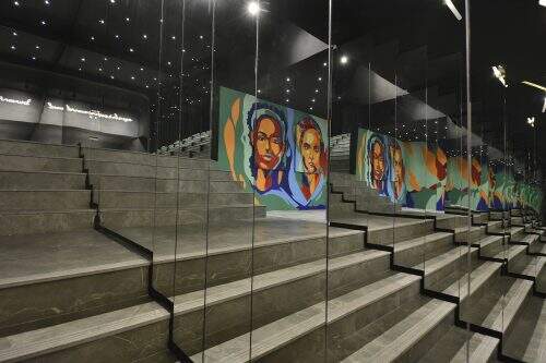 No primeiro patamar, a arte com cores vivas em elementos gráficos misturados com faces femininas que se estendem além das telas para as paredes, chama a atenção e fazem o contraponto de cor no ambiente. A iluminação cênica também é destaque no ambiente. O jogo de luz e sombra da luminária dourada convida todos a subirem pela escadaria, e os focos de luz no segundo lance criam um efeito de céu estrelado. “A ideia é surpreender, gerando uma experiência prazerosa, diferente e única”, ressalta a arquiteta do projeto.