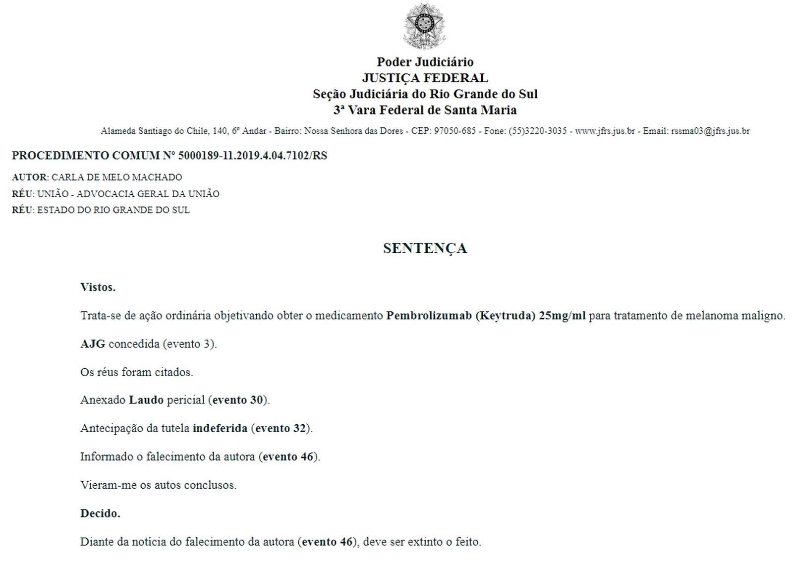 A empresária Carla de Melo Machado, que luta contra um câncer de pele, entrou na justiça para ter acesso a um medicamento para seu tratamento. No entanto, na sentença da 3ª Vara Federal de Santa Maria, ela foi considerada morta.
