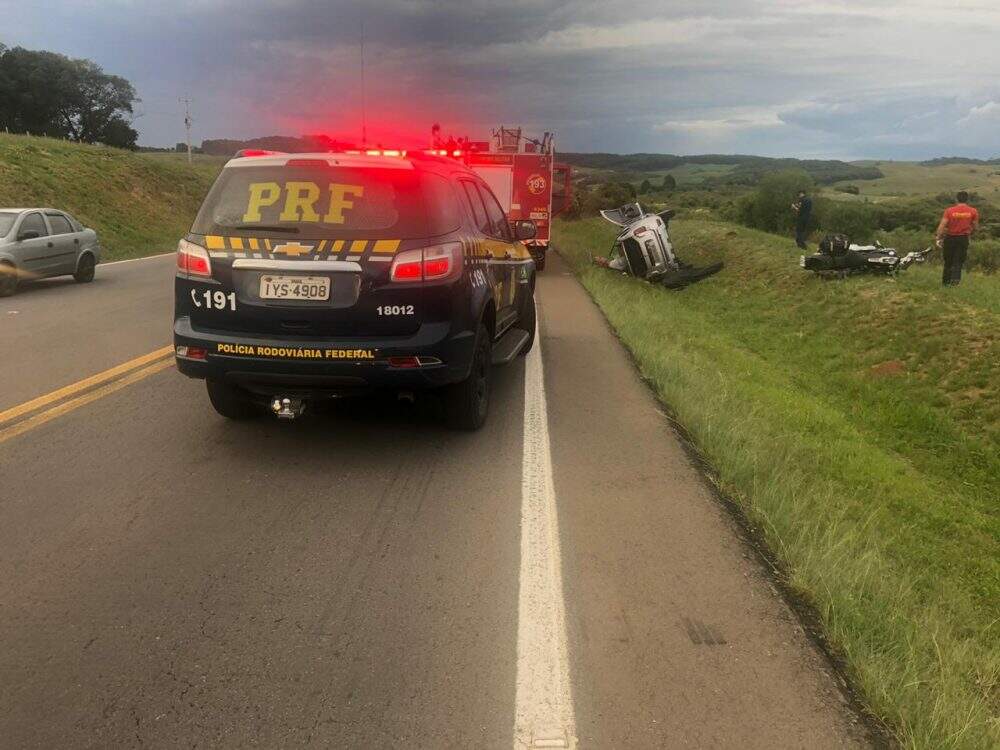 Agentes da PRF foram informados sobre um grave acidente, e deslocaram rapidamente para o atendimento. No local encontraram uma motocicleta Harley Davidson, com placas de Caxias do Sul, e um automóvel Duster, de Santa Catarina. Eles saíram da pista após colidirem.