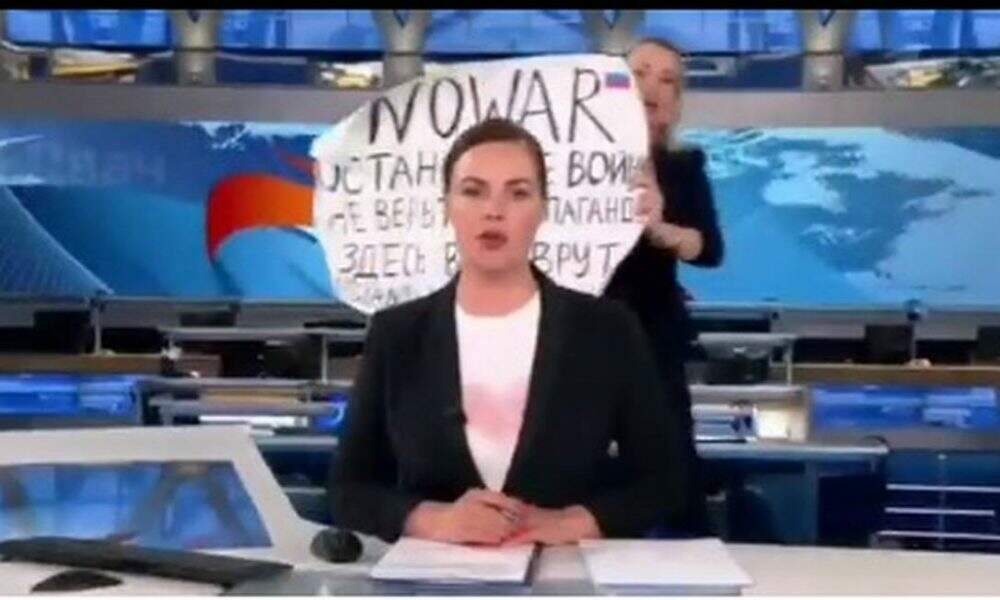 Em meio a uma dura onda de repressão que mira pessoas que se manifestam contra a invasão russa na Ucrânia, Marina invadiu o estúdio de um jornal na principal emissora de TV na Rússia em um ato contra a guerra. Segurando um cartaz onde se liam frases como “não acreditem na propaganda” e “eles estão mentindo para vocês”, o microfone da apresentadora ainda captou seus gritos de “parem a guerra”.