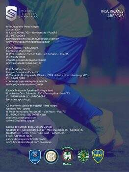 A primeira edição do Mundial de Clubes da Global Stars promete reunir mais de 600 jogadores disputando o título em seis categorias de futebol 7. Iniciativa das escolas PSG Academy Poa, PSG Academy Sinos, Inter Academy Porto Alegre, Marítimo Porto Alegre, Escola de Futebol Boca Juniors Canoas e Escola Academia Sporting Ivoti, o campeonato será itinerante, com rodadas em todas as sedes dos clubes associados. A primeira etapa acontecerá no dia 25 de maio, em Porto Alegre, e a final está prevista para 15 de dezembro, em Novo Hamburgo.