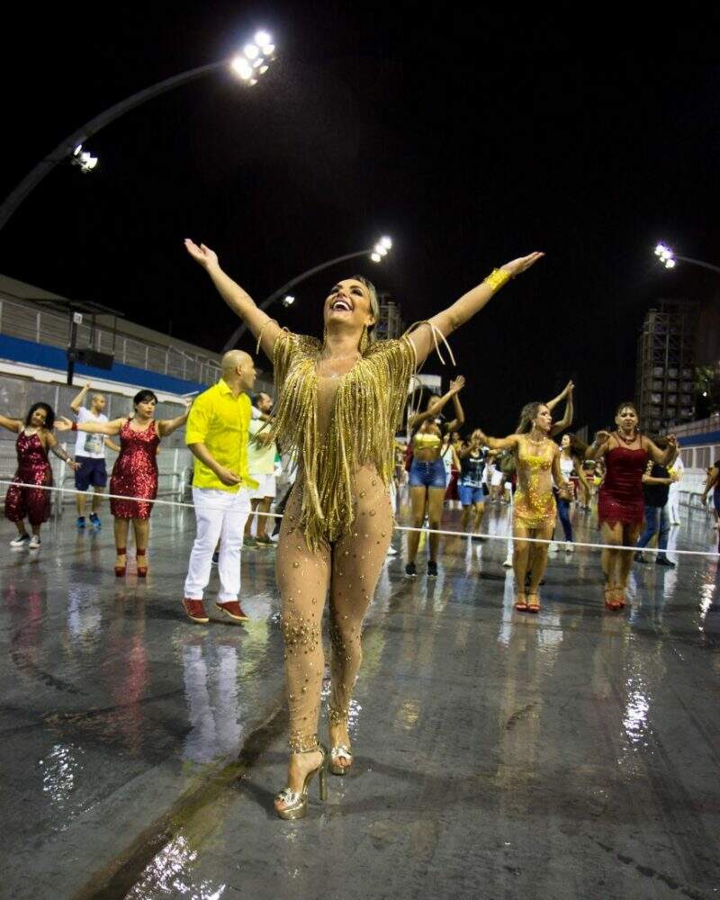 Nem a chuva que caiu na noite de sexta-feira (31) em São Paulo desanimou Francine Carvalho, a musa da Tom Maior, durante o primeiro ensaio técnico da escola no Sambódromo do Anhembi.