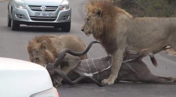 Dois leões chocaram turistas ao matarem um cudu, espécie de antílope, em meio aos carros dos visitantes em uma estrada no Parque Nacional de Kruger, na África do Sul. Publicado no mês passado, o vídeo recebeu mais de 83 mil visualizações.