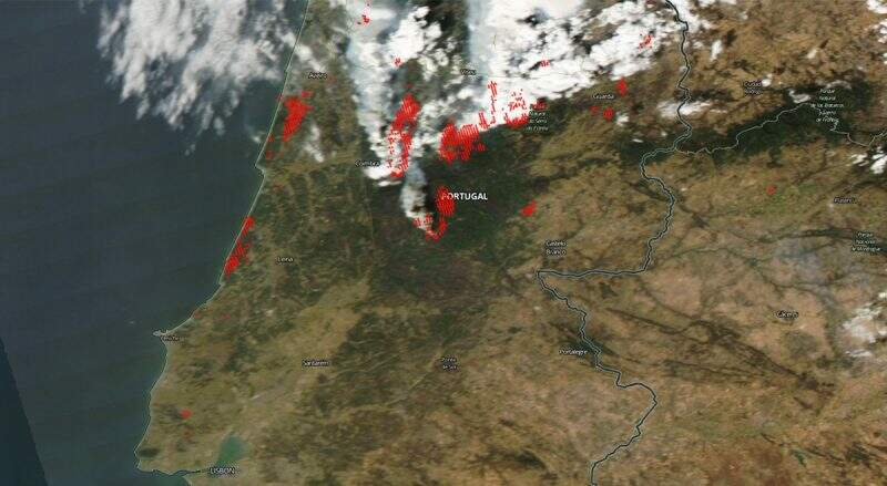 A Nasa divulgou várias imagens do espaço que mostram os incêndios deste domingo em Portugal. Pode-se ver que o Norte é a parte do País mais afetada pelas chamas. O satélite Terra-Água da Nasa captou os diferentes pontos de fogos ativos de Portugal, Galiza e Asturias. O vídeo foi divulgado pela TVGaliza, no Twitter.