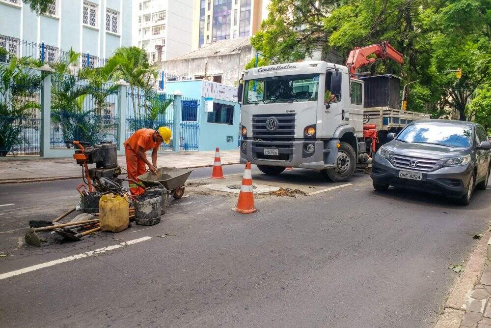 Seguem, na região central de Porto Alegre, os trabalhos do Dmae (Departamento Municipal de Água e Esgotos) para o nivelamento das tampas de ferro em poços de visita (acesso para manutenção e interligação de redes) dos sistemas de esgotamento sanitário e drenagem pluvial.