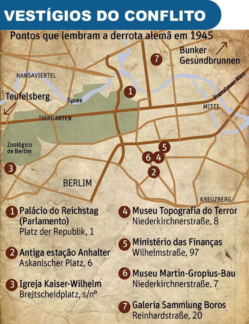 Setenta anos depois, uma parede do Reichstag, o parlamento alemão, preserva pichações dos soldados russos – o local pode ser visitado de graça, com tours guiados até em português. Espalhados pela cidade, outros símbolos lembram a guerra e o fim do regime nazista, que marca até hoje a vibrante capital alemã, cidade que parece estar em constante busca por personalidade.