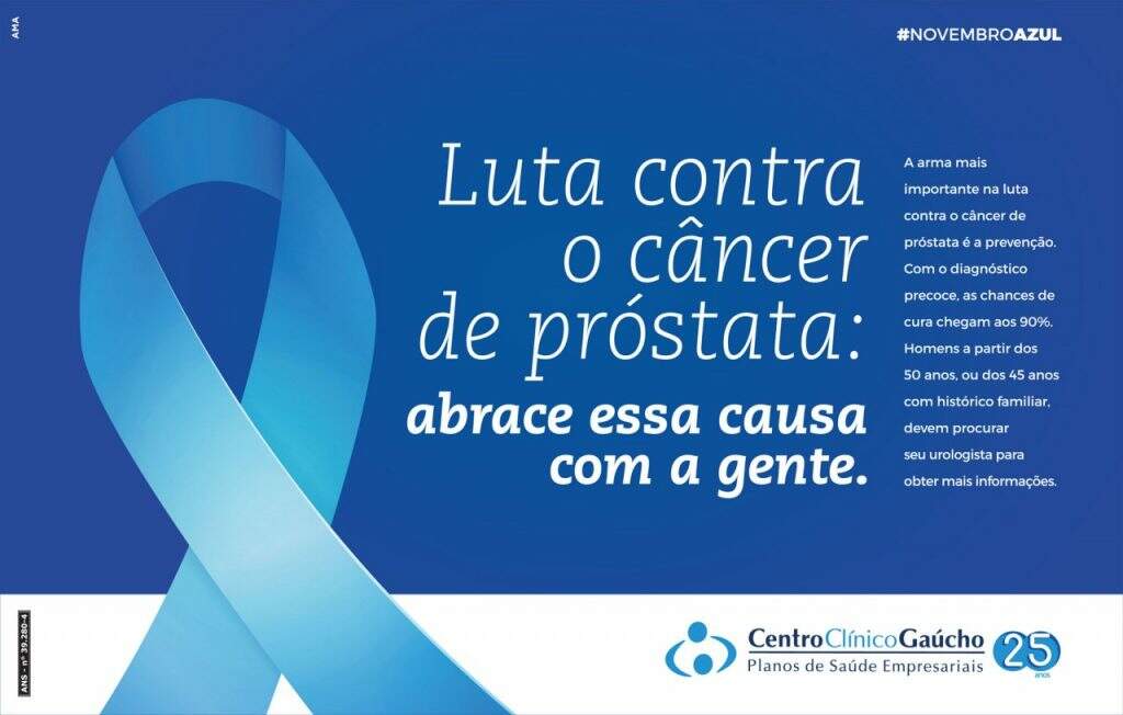 O Centro Clínico Gaúcho dá sequência as suas iniciativas de conscientização de saúde com o lançamento da campanha do Novembro Azul. Assinadas pela Agência AMA, as peças atentam para a importância do diagnóstico precoce do câncer de próstata, segunda doença oncológica que mais afeta os homens brasileiros, segundo o Instituto Nacional de Câncer (INCA).