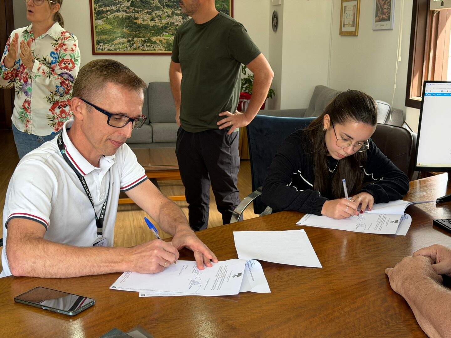 A assinatura do termo contou com a presença do prefeito Daniel Carlos Michaelsen e do presidente do Consepro, Jonatas Luis Furstnow, acompanhado de Isabeli Tomazini Madeira. Também participaram do ato o secretário municipal de Administração, Paulo Marcos Schwantz, e a coordenadora especial de Captação e Projetos Especiais, Simone Bender.