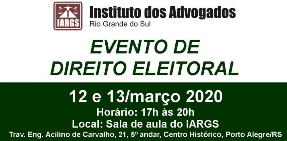 O IARGS promoverá um curso de Direito Eleitoral, nos próximos dias 12 e 13 de março, das 17h às 20h, no quinto andar da sua sede. O evento, com a carga horária de seis horas, foi programado, segundo a coordenadora geral, vice-presidente do instituto, Lucia Kopittke, a partir da constatação da dificuldade dos advogados em obter material para estudar esse tema que, segundo ela, é complexo, bastante diferente dos outros ramos, inclusive a parte processual, referindo-se aos prazos, às formas dos processos e aos tipos de recursos.