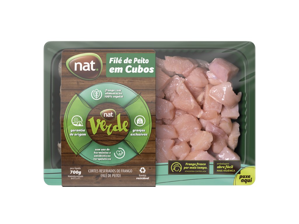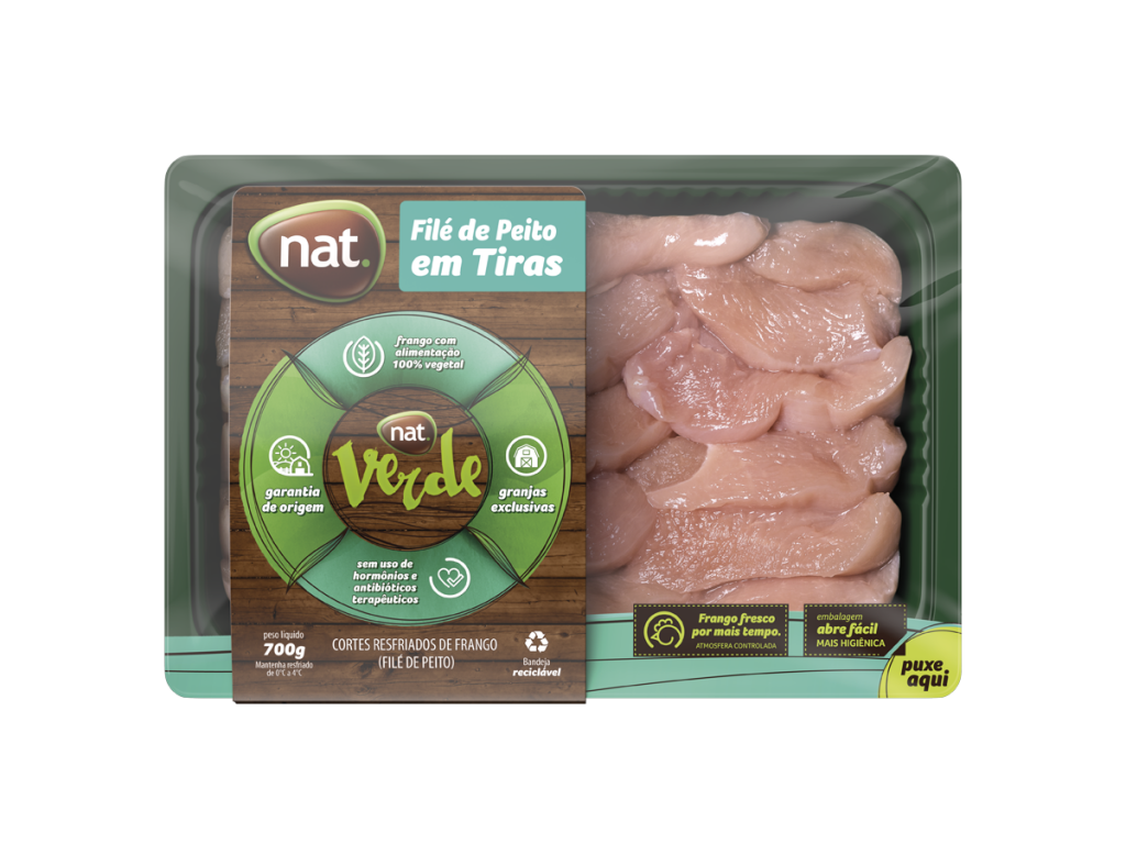 A linha nat. Verde cresce e lança três versões de filé de peito resfriado: em cubos, em tiras e fatiado. As novidades chegam, inicialmente, nos três estados da região Sul, em embalagens, de 700 gramas, com atmosfera controlada, que mantém o produto mais fresco, por mais tempo. Somadas aos já tradicionais coxinha da asa, filezinho sassami, filé de peito, filé da coxa e sobrecoxa, sobrecoxa e meio da asa, reforçam o conceito da linha, que busca oferecer sabor e praticidade na vida de quem cozinha. A nat.Verde conta ainda com três opções de cortes congelados um a um (IQF), totalizando um portfólio de 12 produtos.