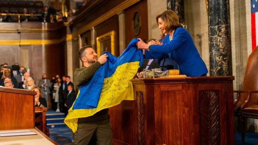 Ao final, Zelensky presenteou o Congresso com uma bandeira ucraniana assinada por soldados ucranianos como um presente para agradecer pelas armas que lhes foram enviadas. Em troca, a presidente da Câmara, Nancy Pelosi, deu a Zelensky uma bandeira dos Estados Unidos dobrada que sobrevoou o prédio do Capitólio nesta quarta-feira (21).