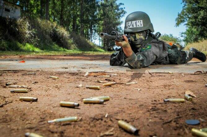 Aqui, deitadas no chão, empunhando fuzis automáticos leves (FAL), estão as primeiras mulheres brasileiras a serem treinadas para combate pelo Exército do Brasil – uma instituição fundada em 1648 que, agora, parece querer tirar o atraso. Desde fevereiro, 37 alunas frequentam a escola campineira, porta de entrada para a formação de oficiais combatentes, inaugurando a presença feminina na linha bélica da força. Aeronáutica e Marinha já formam mulheres oficiais, respectivamente, desde 1996 e 2014.