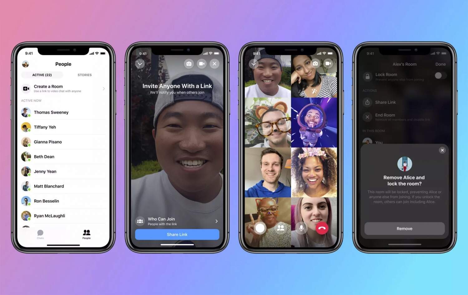 O criador da chamada pode decidir se ela ficará aberta para qualquer usuário por meio de um link ou se será protegida com senha; é possível participar das reuniões mesmo sem um perfil do Facebook. Uma vez lá dentro, os participantes podem usar os filtros de realidade aumentada da câmera do Messenger e trocar seus planos de fundo por imagens ou criações do próprio Facebook.
