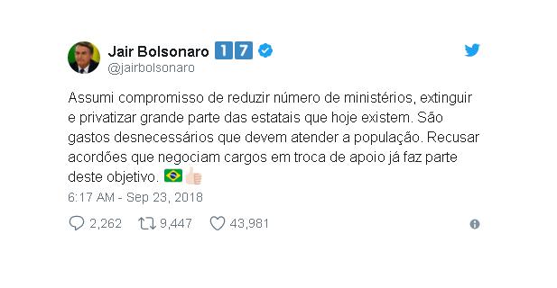 Bolsonaro diz que vai reduzir ministérios, extinguir e privatizar grande parte das estatais