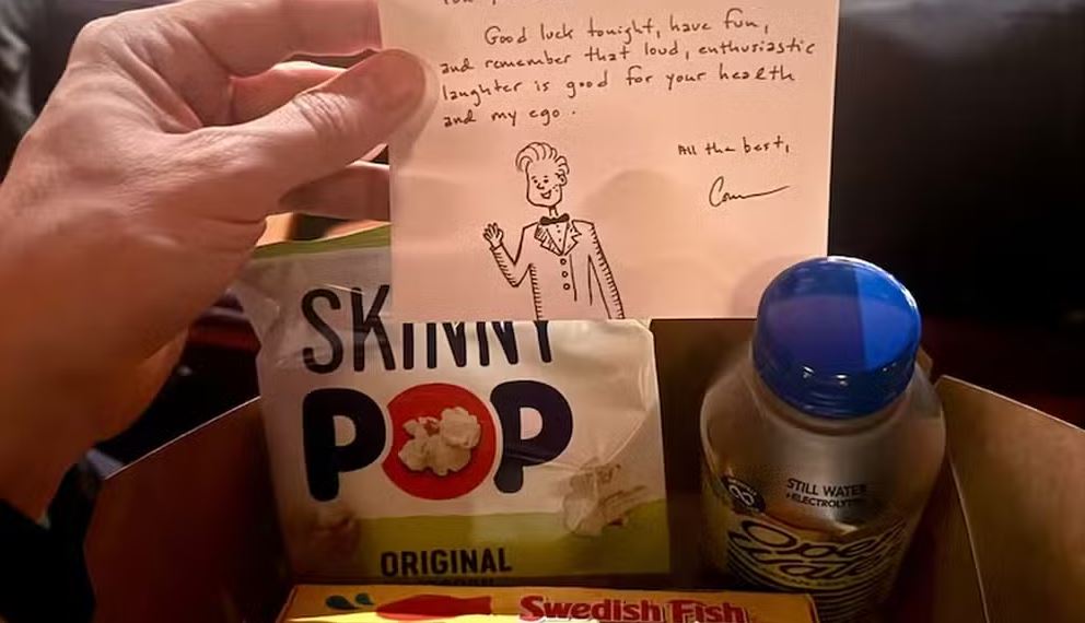 “Boa sorte esta noite. Divirtam-se e lembrem-se de que uma boa gargalhada faz bem para a minha saúde e para o meu ego. Tudo de bom, Con”, escreveu ele ao lado de uma caricatura de si mesmo. Mas o presente não era apenas uma carta. O jornalista do The New York Times, Kyle Buchanan, compartilhou uma foto em sua conta do Facebook da caixa que encontrou embaixo da poltrona. O que havia dentro? Um pequeno pacote de pipoca salgada, uma caixa de balas de goma e uma garrafa de água.