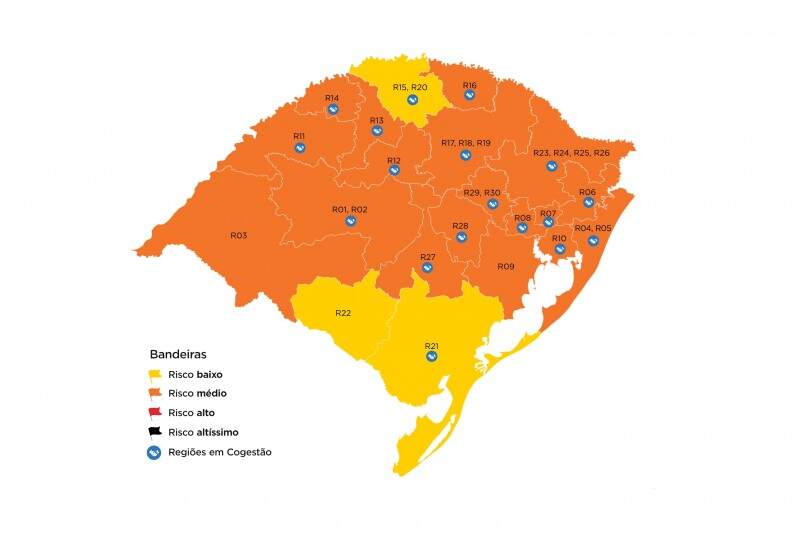 As regiões de Bagé, Palmeira das Missões e Pelotas são as três que apresentaram melhora e passaram para bandeira amarela. As outras 18 regiões seguem classificadas como bandeira laranja. Classificada em bandeira vermelha (risco epidemiológico alto) na 22ª rodada, a região Covid de Santa Maria apresentou melhora de indicadores e retorna à bandeira laranja nesta semana.