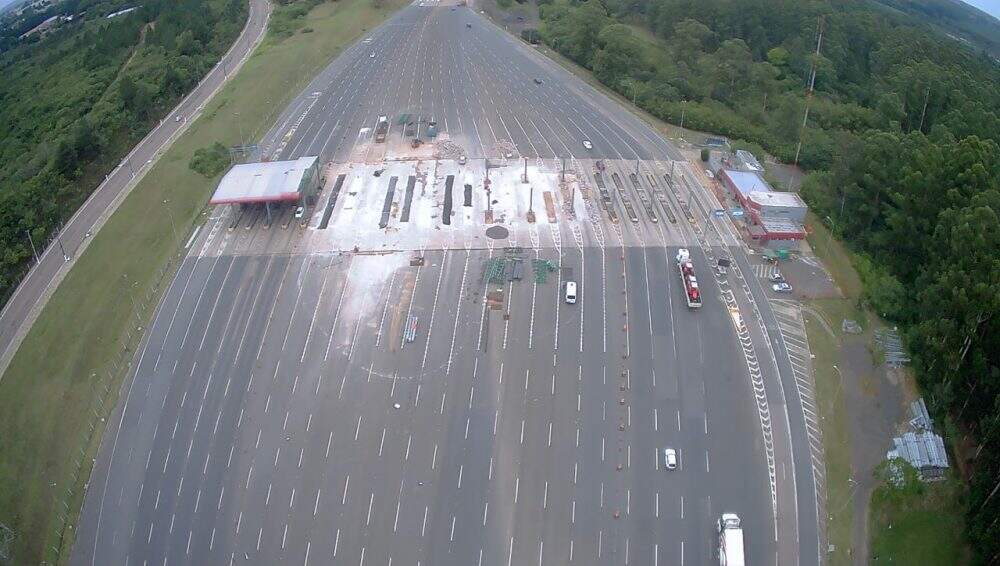 Segundo a CCR ViaSul, que administra a rodovia, 80% dos serviços previstos já foram executados e, agora, os esforços estão concentrados na regularização do pavimento onde ficavam as antigas cabines, de forma a liberar o tráfego sem a necessidade de desvio, em ambos os sentidos.