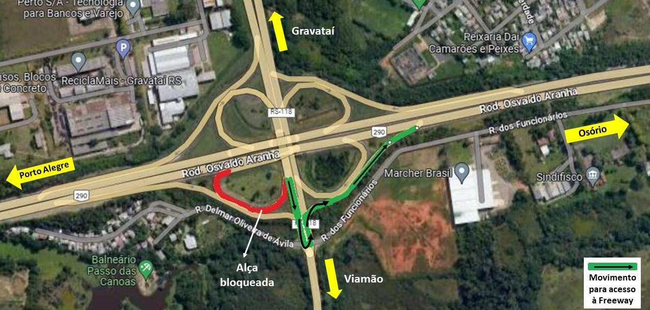 Já o segundo bloqueio acontecerá também no sábado (1), a partir das 22h, porém, deve seguir até as 6h do domingo (2), com obras sendo realizadas na alça de acesso a Viamão (ERS-118). Como alternativa, a orientação é de que os motoristas façam o balão completo na interseção, acessando a alça à direita após a ERS-118, seguindo por baixo da Freeway. Na sequência, devem subir pela alça sentido à pista Oeste da Freeway e, novamente, utilizar a alça à direita, acessando a ERS-118, passando outra vez debaixo da Freeway.