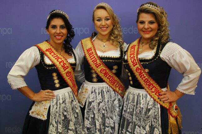 Comitiva da Oktoberfest de Igrejinha durante visita à Rede Pampa. FOTO: LUCAS UEBEL