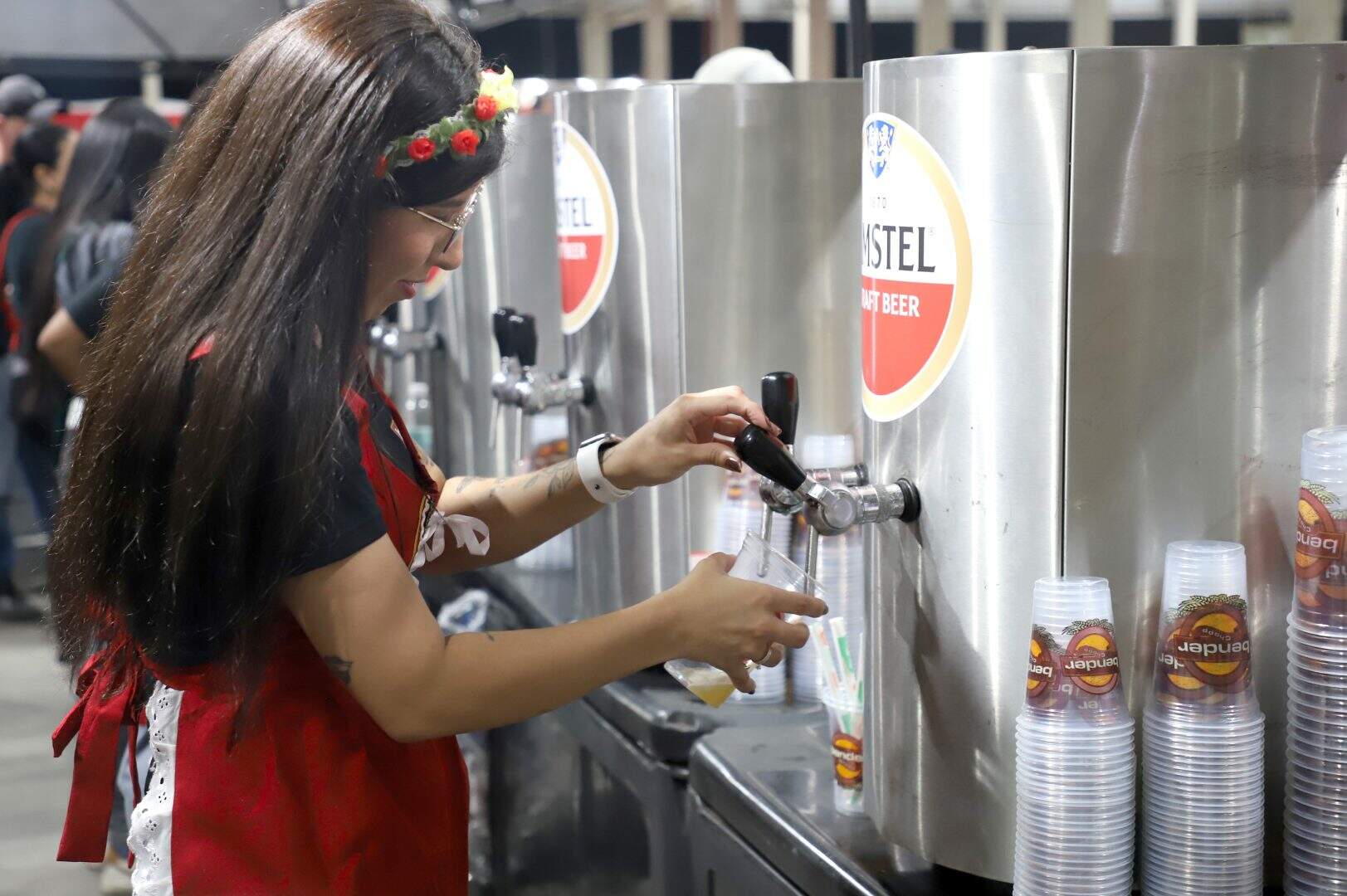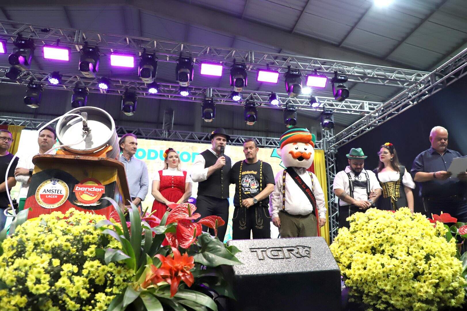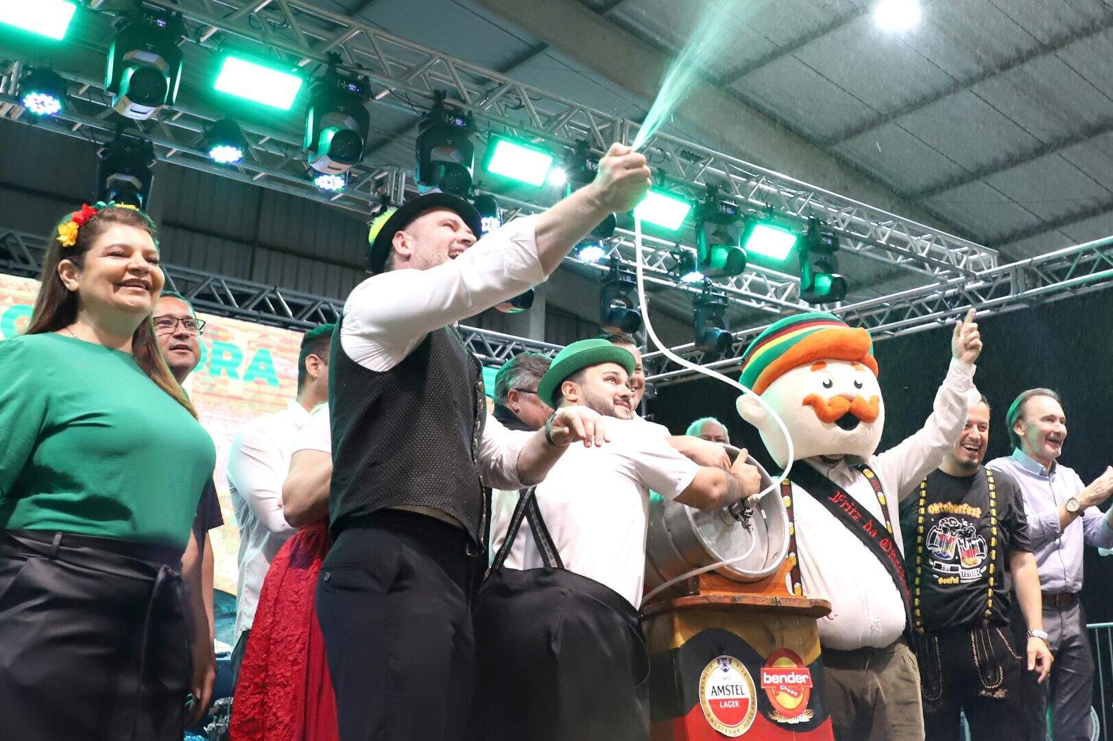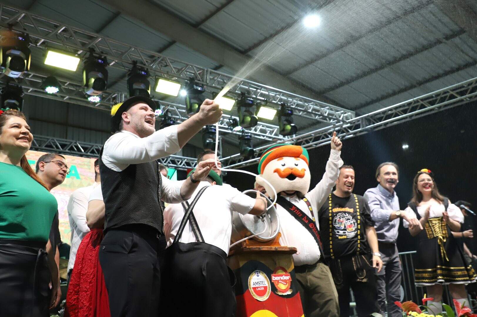 Foto: Leo Henrique - PMEA Oktoberfest de Esteio começou em grande estilo na noite desta quinta-feira (23), com a tradicional sangria do barril e um banho simbólico de chope no público, marcando oficialmente a abertura da festa no Parque Estadual de Exposições Assis Brasil. O ato foi conduzido pelo prefeito Felipe Costella e pelo secretário municipal de Cultura, Esporte e Lazer, Brayon Marques, diante de uma plateia animada que lotou o Pavilhão da Agricultura Familiar.