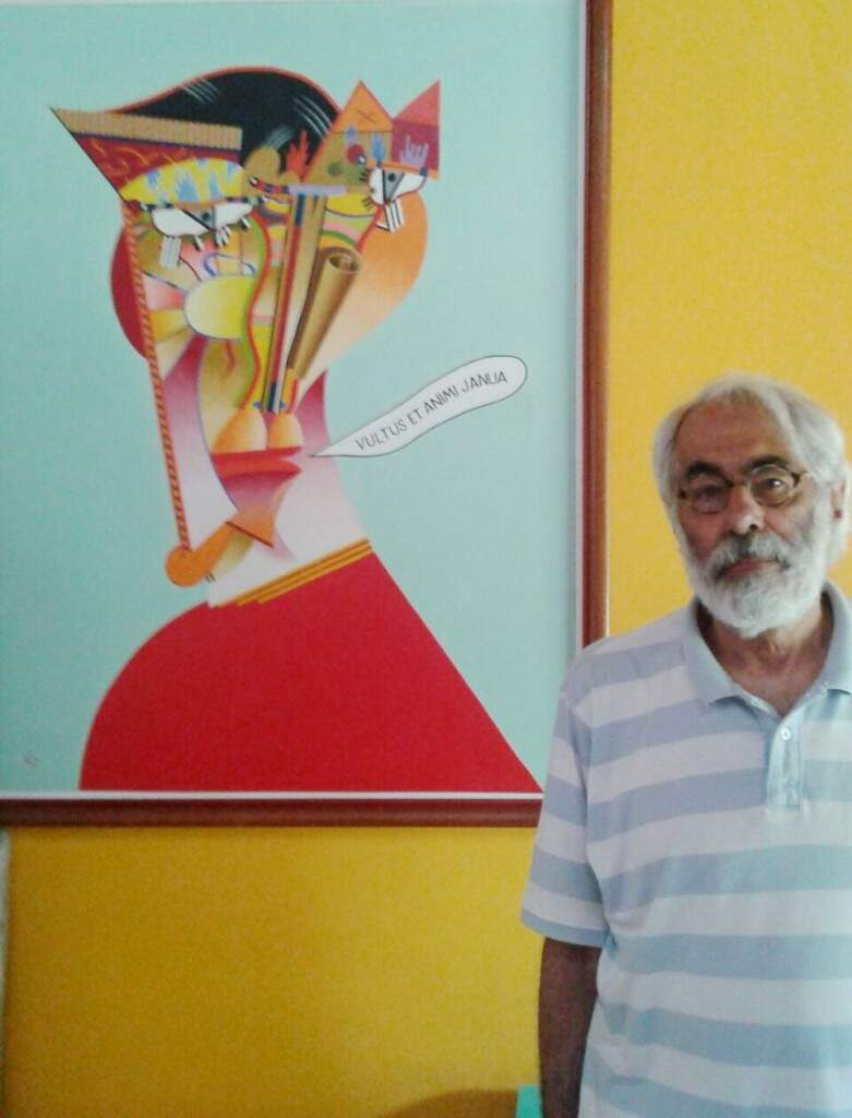 Roberto Magalhães ao lado do seu belo quadro com a inscrição “Vultus et Animi Janua”. (Foto: divulgação)