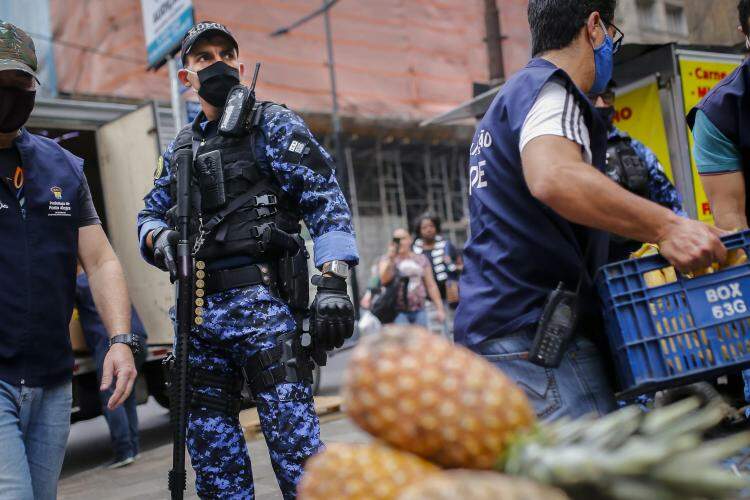 Foto: Anselmo Cunha/PMPAA prefeitura registrou nesta sexta-feira (24), a maior operação de combate ao comércio ilegal na Capital realizada nos últimos três anos. Ao todo, 34 viaturas e 60 agentes da Diretoria de Fiscalização da Secretaria Municipal de Desenvolvimento Econômico, Guarda Municipal e Romu, em conjunto com a Brigada Militar, estiveram envolvidos na ação para coibir a atividade irregular no Centro Histórico. A região reúne a maior concentração de ambulantes do Município. Foram apreendidos cerca de sete mil produtos falsificados e sem procedência, assim como aproximadamente 1,5 mil quilos de frutas e verduras.