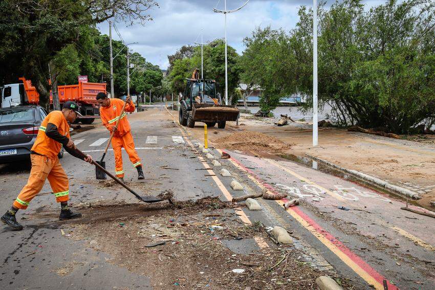 No turno da tarde, conforme as águas começaram a baixar, também foi iniciada a limpeza do calçadão da praia do Lami. Ao menos 130 garis das seções Centro, Sul e Extremo-Sul do DMLU executaram os serviços de raspação do lodo, varrição de resíduos e remoção de materiais acumulados nos locais citados.