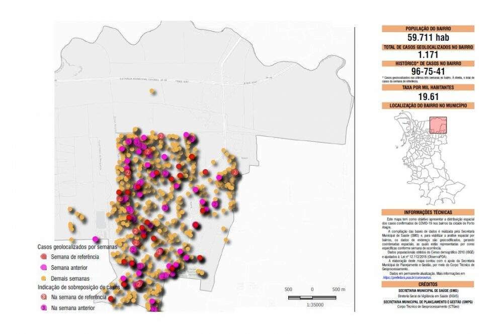 Os detalhes incluem dados sobre a população total de cada bairro, indicação visual (inclusive do local de residência dos pacientes, mediante sinalização gráfica por pontos coloridos), histórico de casos nas últimas três semanas e taxa de incidência de infectados para cada mil habitantes. A atualização será semanal.