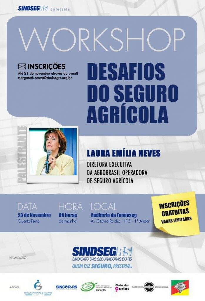 Com mais uma safra de verão se aproximando, o mercado segurador se reúne em um workshop para discutir os desafios do seguro agrícola no país. A palestrante do evento será a Diretora Executiva da AgroBrasil Operadora de Seguro Agrícola, Laura Neves. O encontro ocorre no próximo dia 23 (quarta-feira), às 9 horas, no Auditório da Funenseg (Av. Otávio Rocha, 115 2° andar). As inscrições podem ser feitas até o dia 21 de novembro através do e-mail margareth.souza@sindsegrs.com.br.