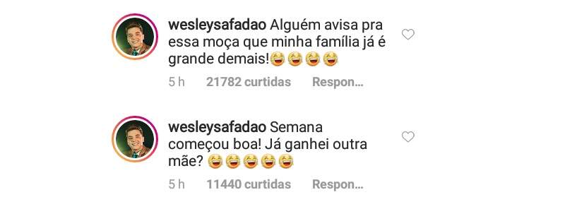 Em um desses perfis, Safadão comentou em tom irônico. “Alguém avisa pra essa moça que minha família já é grande demais!”, escreveu. O artista ainda adicionou emojis de gargalhadas. O cantor também deixou mais uma mensagem no mesmo post. “Semana começou boa! Já ganhei outra mãe?”, perguntou.
